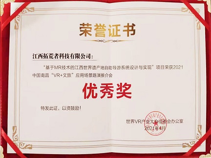 專家組圍繞應用場景技術水平、可復制性、創新性、市場需求、線下演講水平、線上投票得分等多維度、綜合性評分標準,最終我司《基于MR技術的江西世界遺產地自助導游系統設計與實現》項目榮膺2021中國南昌“VR+文旅”應用場景路演推介會優秀獎。