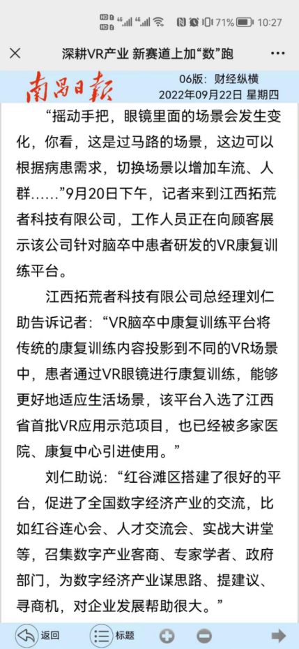 2022年9月,南昌廣播電視臺新聞綜合頻道記者及南昌日報財經縱橫版記者來公司采訪,公司副總經理倪飛接待了采訪記者一行。在研發中心實驗室,記者對我公司VR腦卒中“沉浸式”康復訓練平臺進行專題新聞采訪報道。