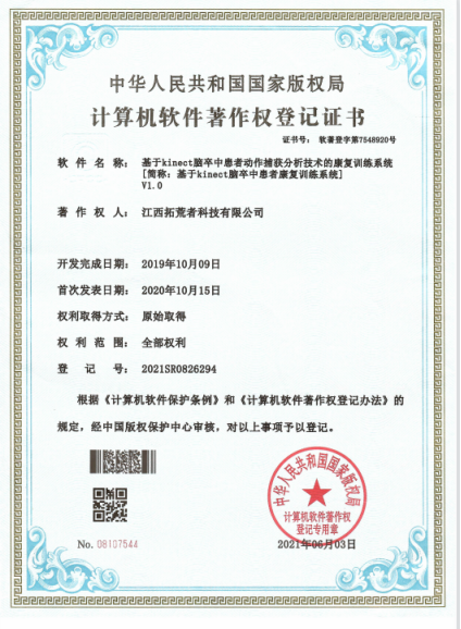 公司目前獲得《基于VR技術的康復評定與訓練系統裝置》實用新型專利一項,《基于kinect腦卒中患者動作捕獲分析技術的康復訓練系統》軟著一項。
